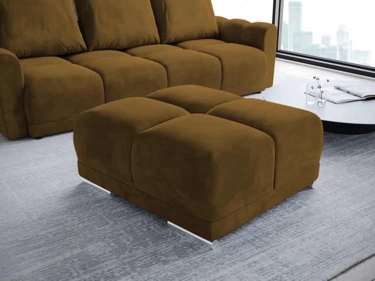 Narożnik został obity tkaniną Now or Never, która należy do rodzaju boucle. Charakteryzuje się ona subtelną, pętelkową fakturą, przypominającą owczą wełnę. Dzięki temu materiał dodaje meblom głębi i wyrazistości, nadając im elegancki wygląd, a jednocześnie wprowadza do wnętrza przytulność i nutę luksusu. Tkanina jest wyjątkowo miękka i przyjemna w dotyku, co podnosi komfort użytkowania mebli tapicerowanych. Świetnie sprawdzi się w salonie, gdzie istotne są zarówno wygoda, jak i estetyka.