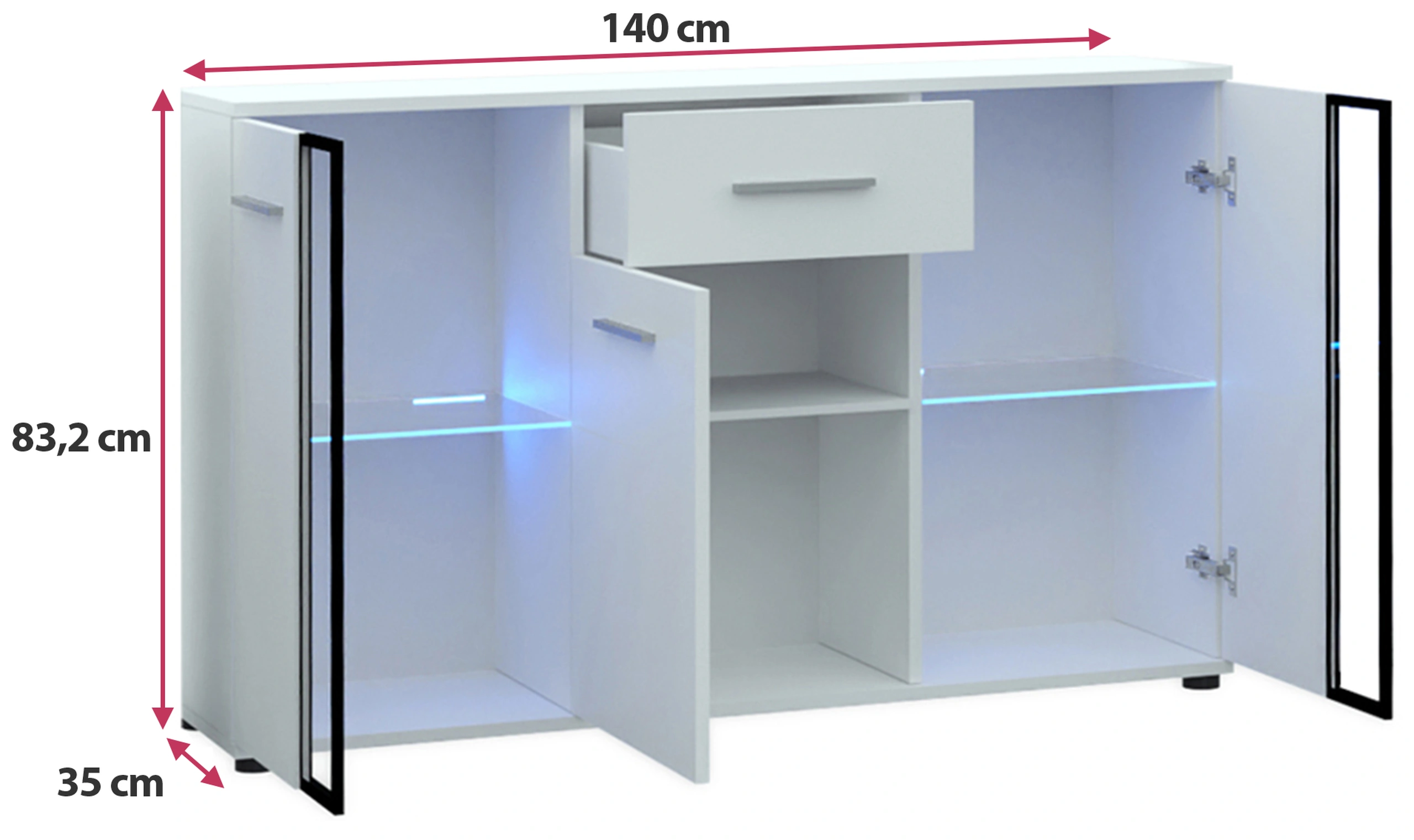 Oświetlenie LED - Komoda posiada możliwość doposażenia w dedykowane oświetlenie szklanych półek LED, które znajduje się w zakładce "Kup razem" pod galerią zdjęć.