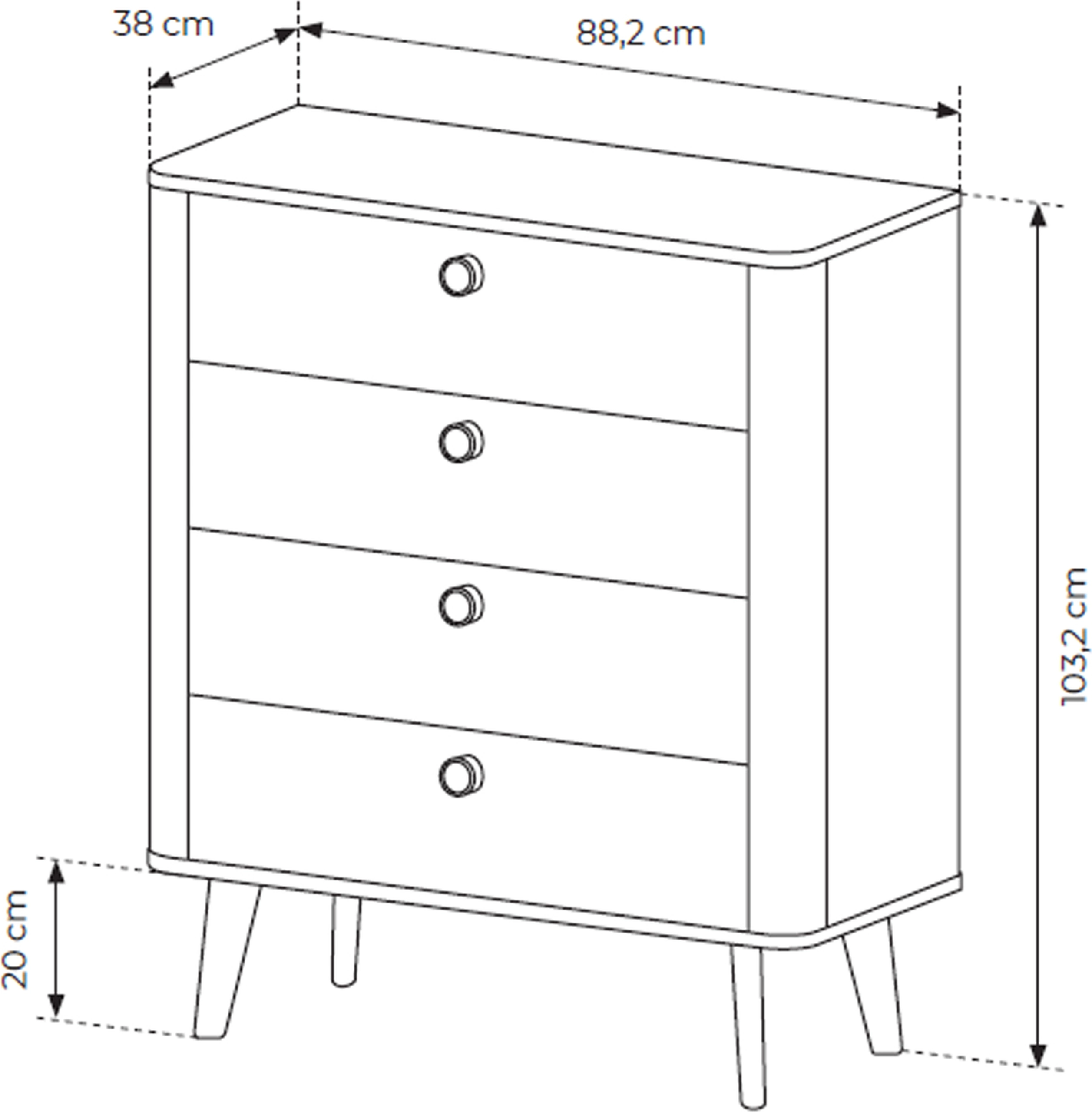 Wysoka na 103 cm bryła z czterema funkcjonalnymi szufladami sprawia, że z łatwością zorganizujesz przestrzeń, zachowując przy tym estetykę wnętrza. Drewniane elementy i wybarwienie dąb barista dodają ciepła, tworząc przytulny klimat w każdym pomieszczeniu.