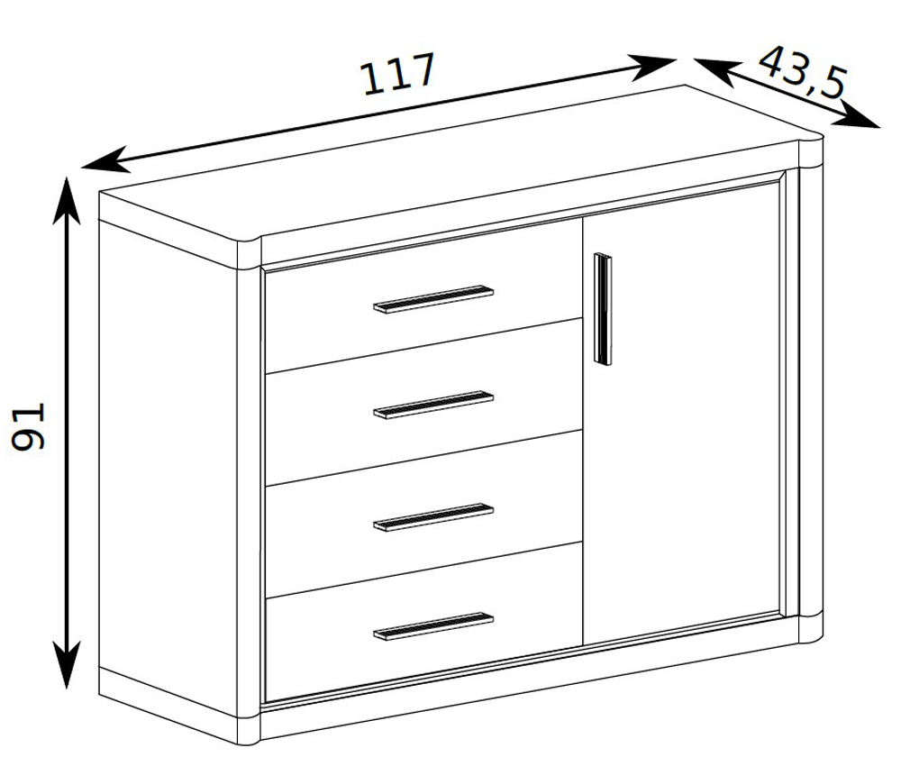 Komoda DENEA to nowocześnie wykonana propozycja, która dzięki swojej stylistyce znajduje uznanie we współczesnych aranżacjach salonów. Komoda została wyposażona w cztery pojemne szuflady po lewej stronie oraz szafkę, w której znajduje się półka po prawej stronie.