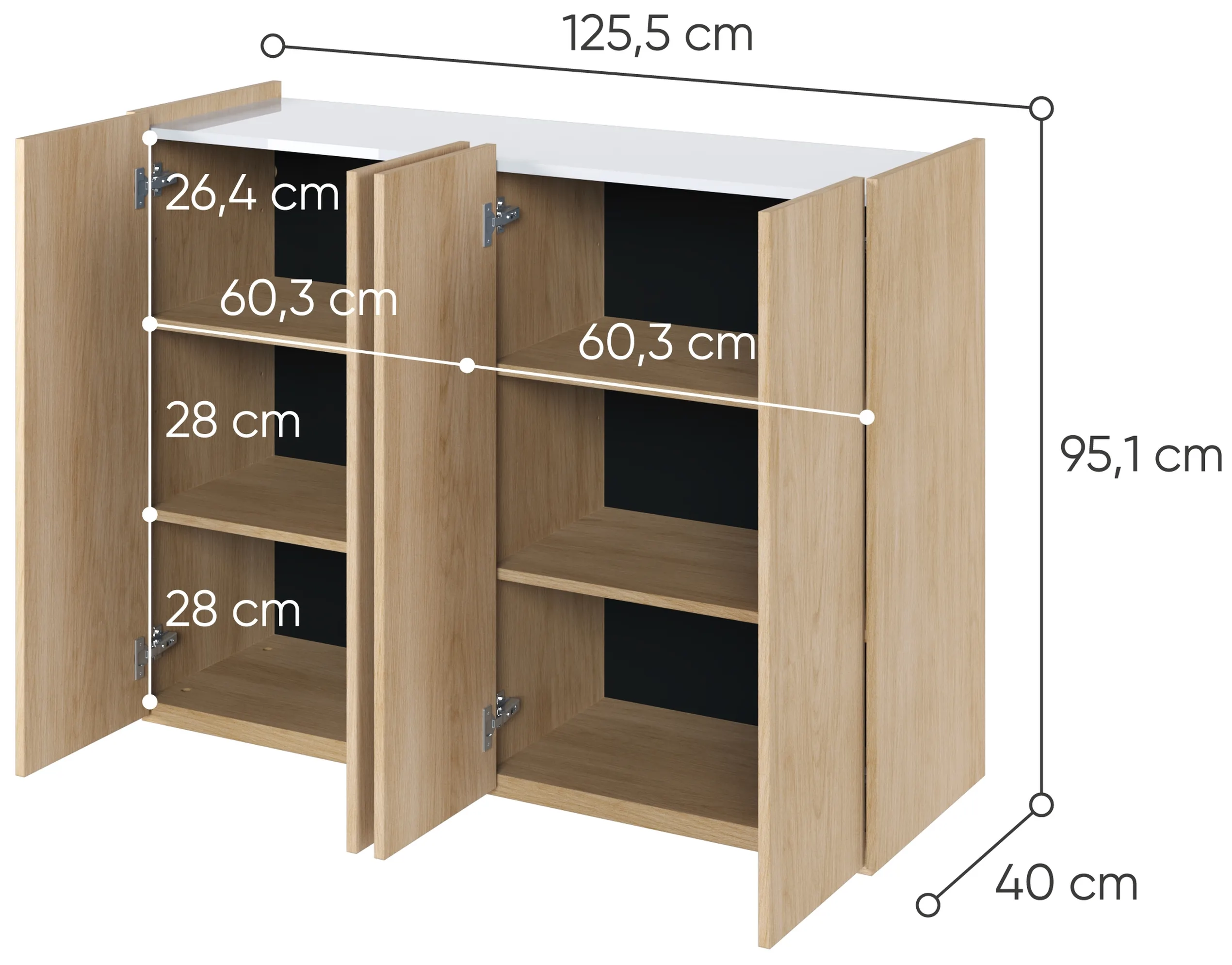 - Komoda posiada cztery drzwi wyposażonych w zawiasy puszkowe z cichym domykiem. Zapewni to ciche zamykanie i pozwoli zapomnieć o trzaskach i hałasach.
