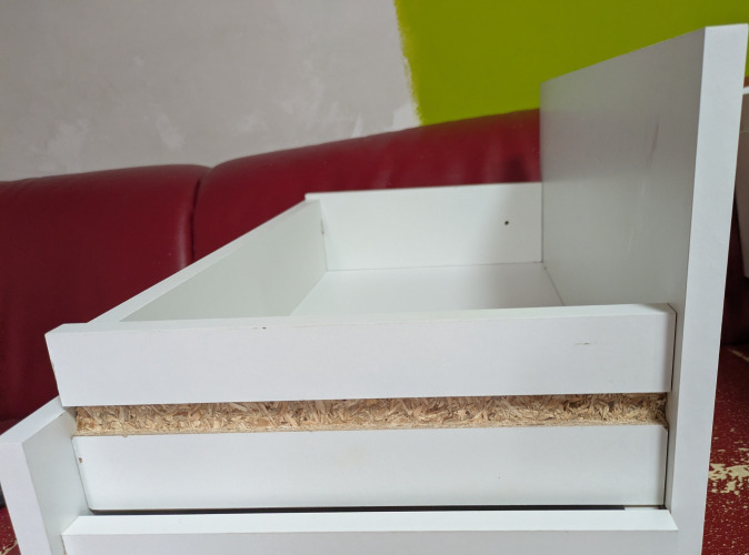Całość komody została wykonana z wytrzymałej płyty laminowanej, co gwarantuje odporność na codzienne użytkowanie i łatwość w utrzymaniu czystości. Obrzeża mebla są dodatkowo zabezpieczone okleiną ABS, która chroni krawędzie przed uszkodzeniami mechanicznymi oraz wilgocią, co wydłuża trwałość produktu.