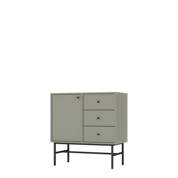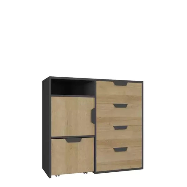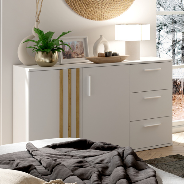 Komoda została zaprojektowana z myślą o maksymalnej funkcjonalności. Na górze znajdują się trzy przestronne szuflady osadzone na prowadnicach kulkowych, które gwarantują płynne i ciche otwieranie. To idealne miejsce na przechowywanie drobnych przedmiotów, dokumentów czy akcesoriów.
