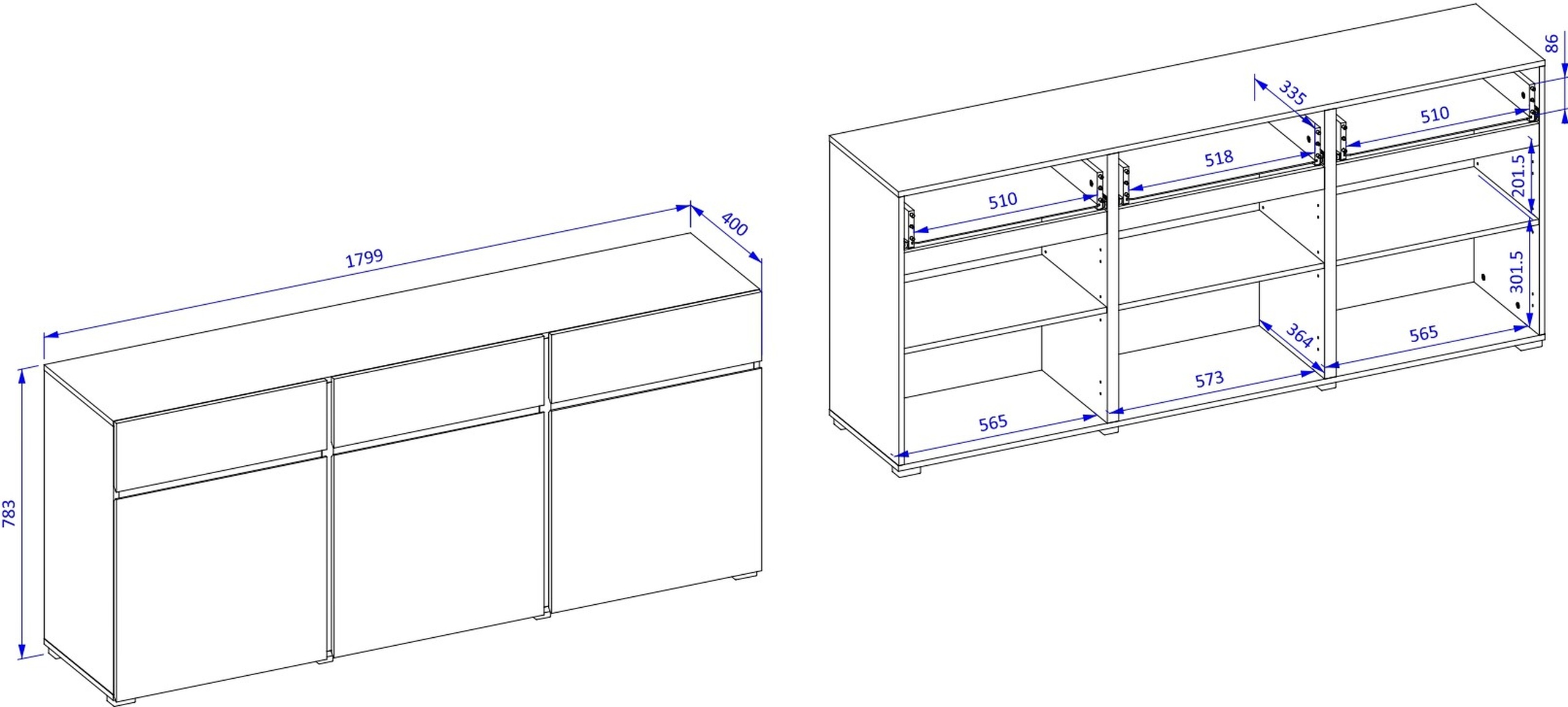 - Korpus i fronty wykonane zostały z płyty laminowanej o grubości 15 mm.
