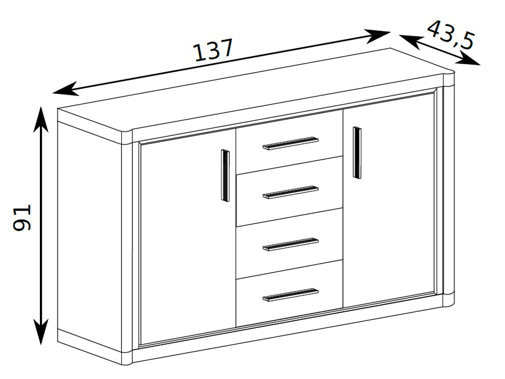 Komoda DENEA to bardzo pojemna propozycja, która pozwoli ci przechować niezbędne akcesoria oraz część garderoby. Została wyposażona w szafkę po lewej oraz prawej stronie, w każdej z nich znajduje się półka. Dodatkowo w centralnej części komody swoje miejsce znalazły cztery pojemne szuflady.