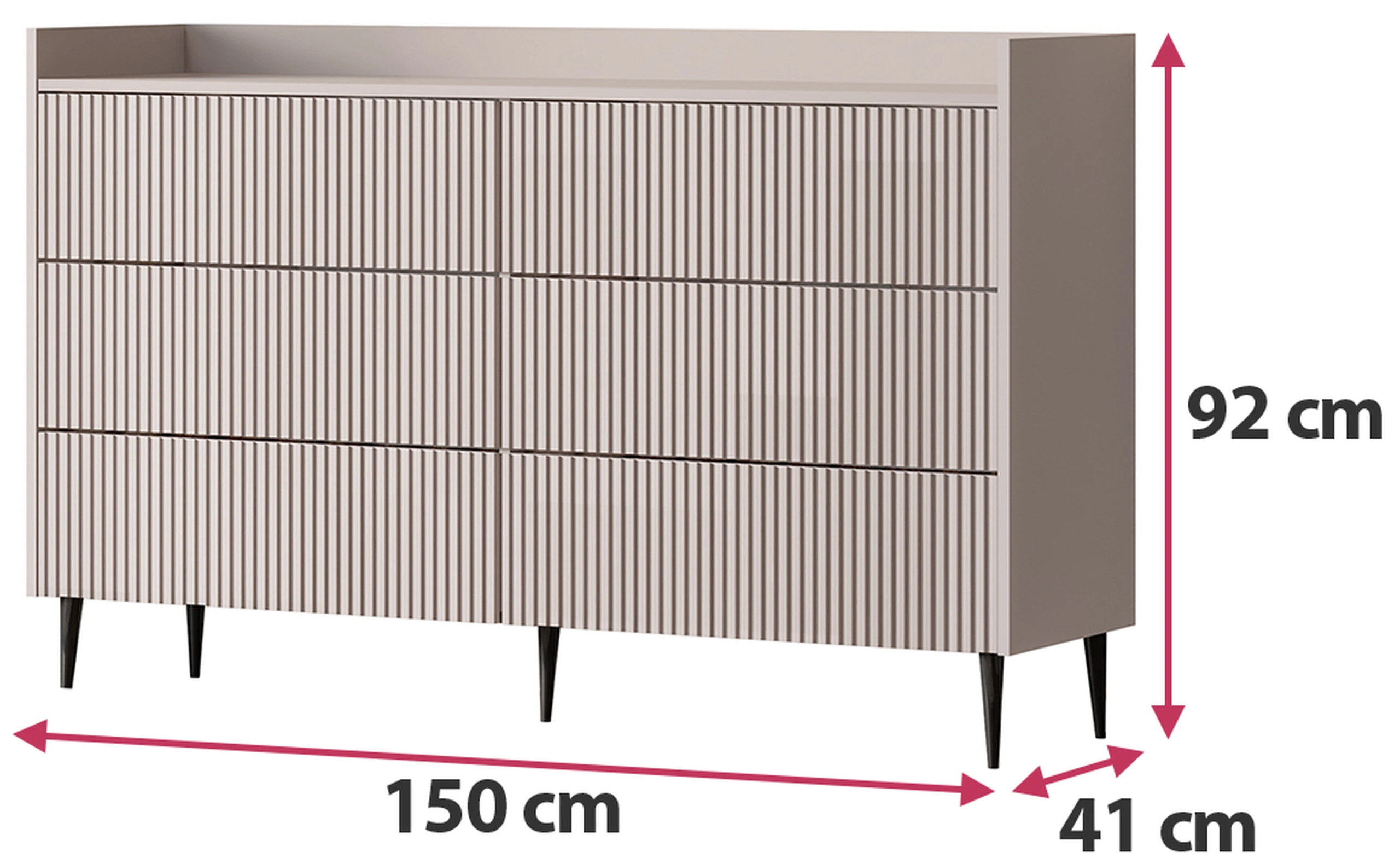 Sześć przestronnych szuflad, osadzonych na trwałych, kulkowych prowadnicach, zapewnia płynne otwieranie i zamykanie, a także komfortowy dostęp do przechowywanych rzeczy. Ryflowane fronty z płyty MDF tworzą przyjemną teksturę, która łamie jednolitą formę mebla, nadając mu wyjątkowego charakteru. Drzwi otwierane za pomocą systemu push to open podkreślają nowoczesny, minimalistyczny wygląd komody, jednocześnie zwiększając wygodę użytkowania.