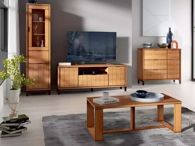 Zestaw składa się z dwóch pojemnych witryn, które w środku mają 3 półki z płyty. Dwudrzwiowej szafki RTV z półeczką pośrodku oraz półki wiszącej, która pozwoli na zgromadzenie i zaprezentowanie kolekcji książek, zdjęć lub rodzinnych pamiątek. Meblościanki dostępne są w kilku modnych wersjach kolorystycznych, więc będą pasować do każdego wnętrza.