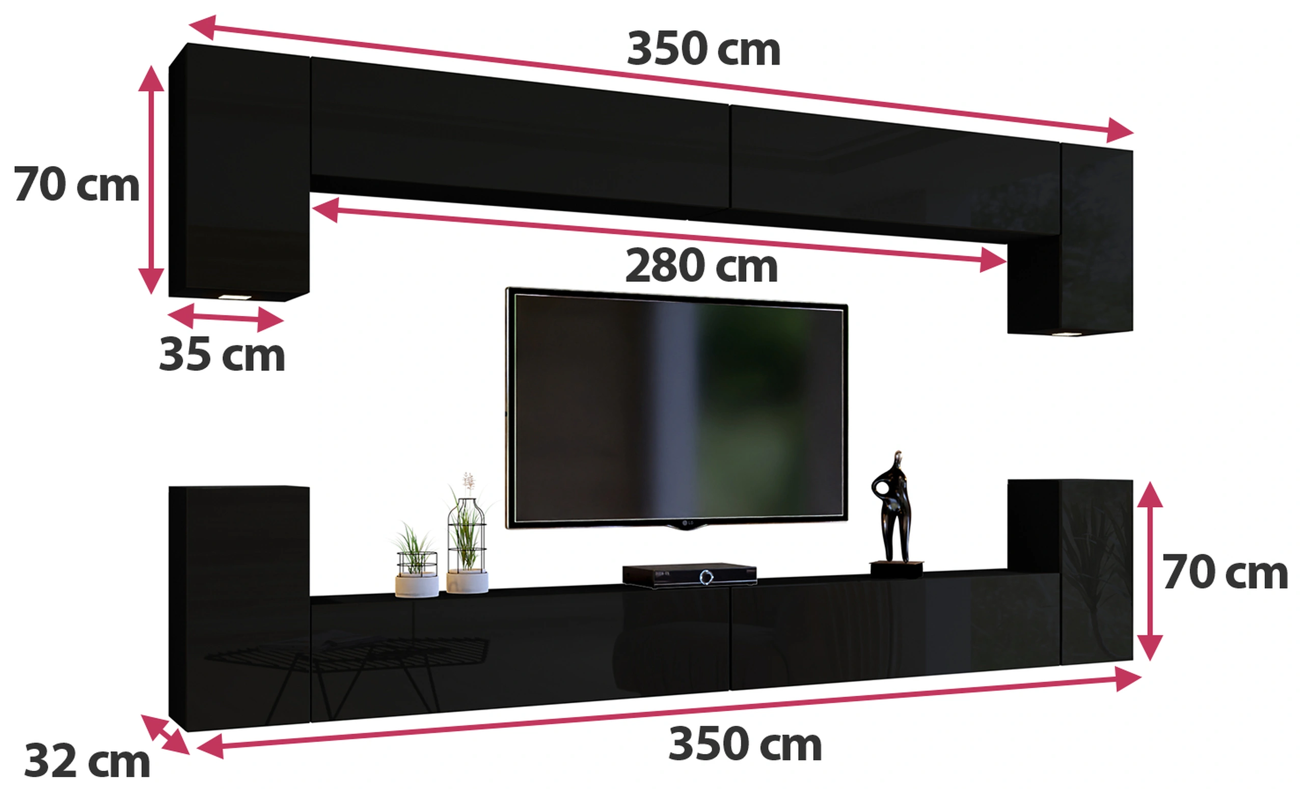 Nowoczesna meblościanka do salonu czarny połysk 350 cm PREMIUM
