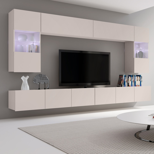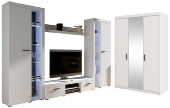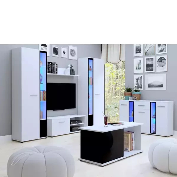 Zestaw mebli wyróżnia się nowoczesnym designem, podkreślonym przez wykończenie na wysoki połysk i szklane wstawki. Jego wysoka jakość wykonania zapewnia trwałość i niezawodność. Ten zestaw mebli to elegancja, styl i funkcjonalność w jednym, przekształcając Twój salon w miejsce pełne nowoczesnej elegancji.