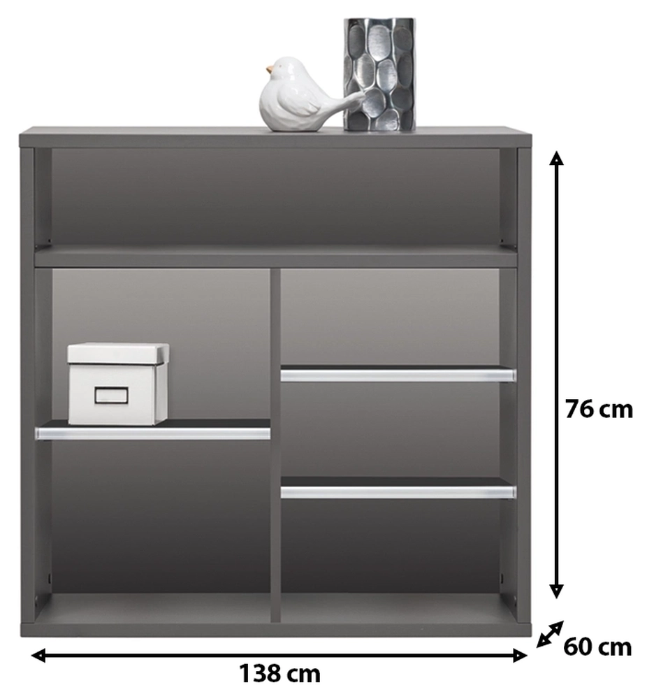 Pod szufladą znajdują się drzwi, za którymi skrywają się trzy przestronne półki. Te półki są idealne do przechowywania większych przedmiotów, takich jak gry, pudełka na buty czy plecaki. Każda z nich została zaprojektowana z myślą o optymalnym wykorzystaniu przestrzeni, pozwalając na uporządkowanie wszystkich najpotrzebniejszych rzeczy.