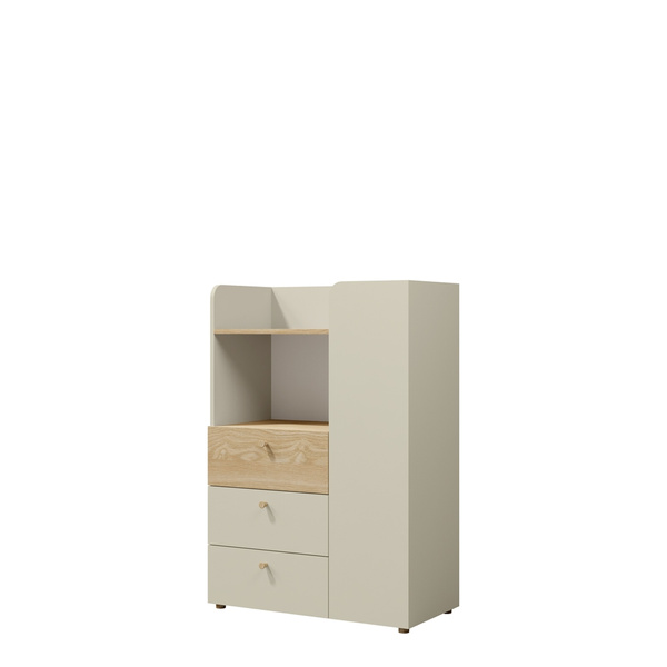 Szafa została zaprojektowana z myślą o maksymalnej organizacji przestrzeni. Po lewej stronie znajduje się para drzwi, które otwierają się, aby odsłonić przestronną komorę idealną na większe przedmioty, takie jak odzież wierzchnia czy kurtki. Pod drzwiami umieszczono trzy pojemne szuflady na prowadnicach kulkowych, które gwarantują płynne i ciche otwieranie. To doskonałe miejsce na przechowywanie bielizny, akcesoriów lub innych drobnych przedmiotów.