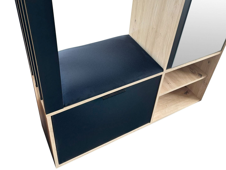 Wewnątrz szafy znajdują się cztery półki po prawej stronie, co pozwala na uporządkowanie drobiazgów oraz drążek na wieszaki i półka po lewej stronie, co umożliwia przechowywanie koszul, bluzek czy kurtek wieszanych na wieszakach.