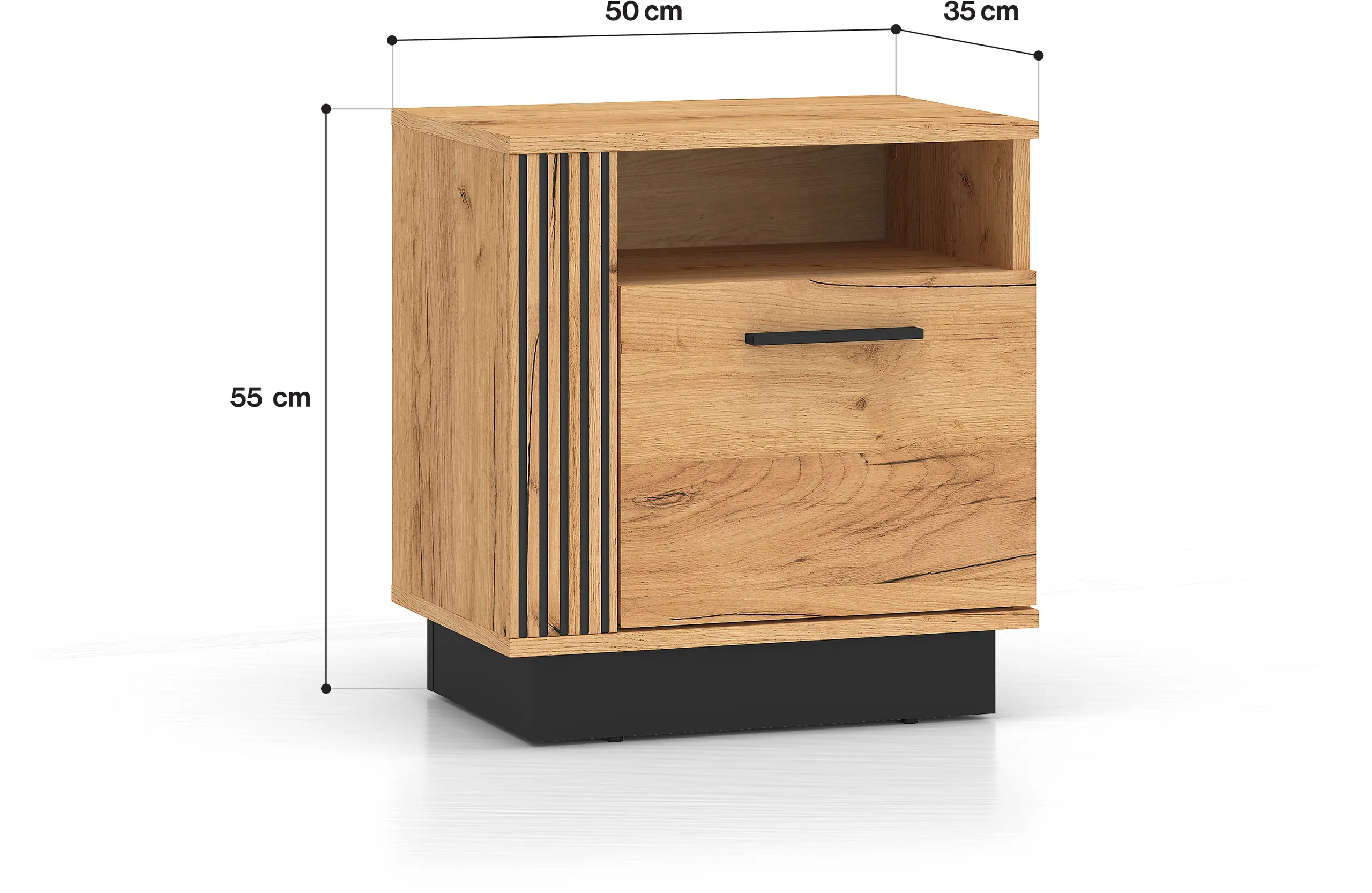 Ta funkcjonalna szafka nocna o szerokości 50 cm to doskonałe uzupełnienie nowoczesnej sypialni. Łączy w sobie elegancki design, inspirowany stylem loftowym, z praktycznymi rozwiązaniami do codziennego użytku. Połączenie dekoru dąb craft złoty z czarnymi detalami oraz subtelne lamele tworzą niepowtarzalny efekt wizualny, który doskonale współgra z innymi meblami z tej samej kolekcji.