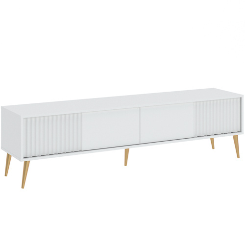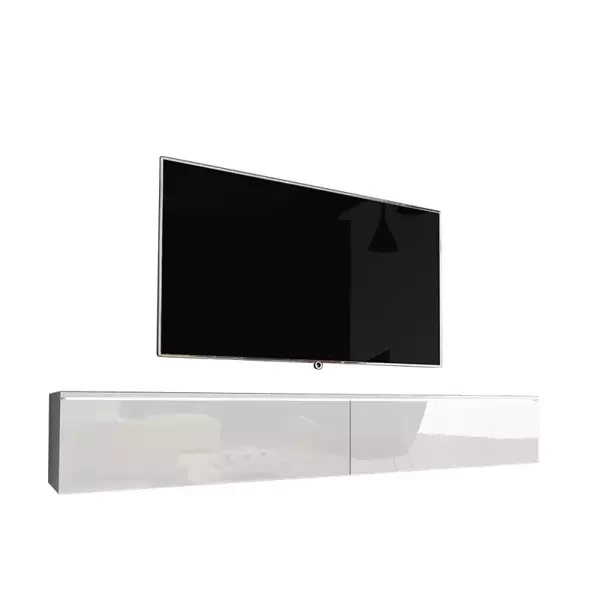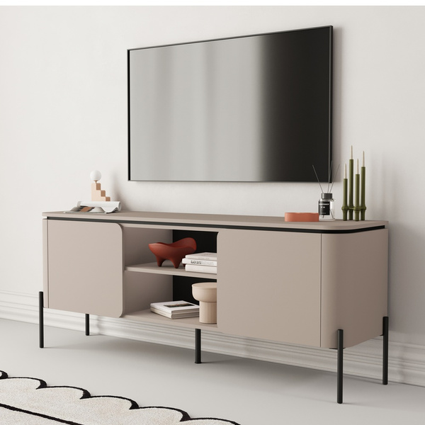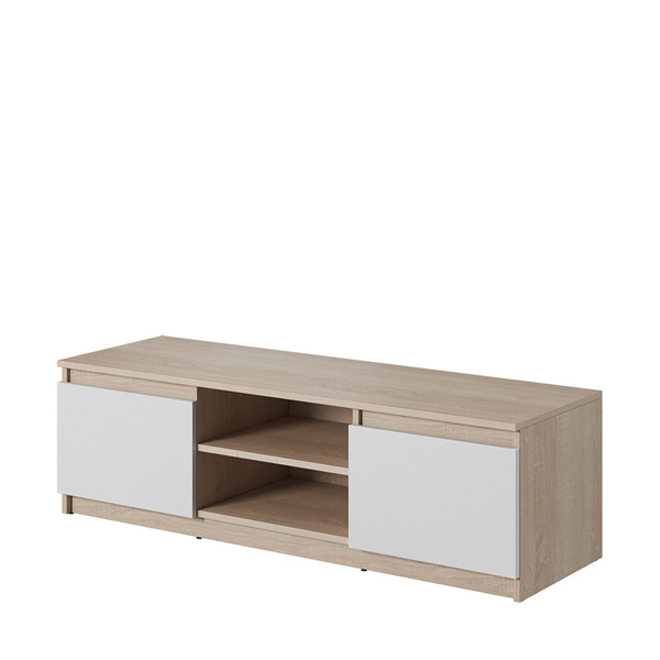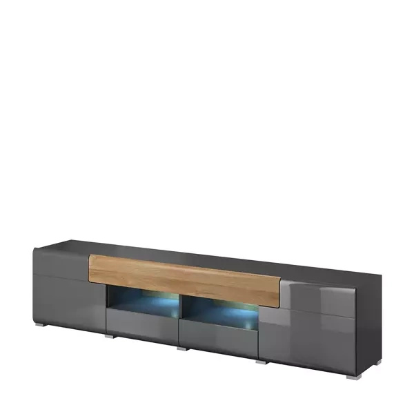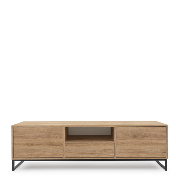 Szafka RTV o długości 180 cm wyróżnia się minimalistycznym, a zarazem eleganckim wyglądem. Drzwi po prawej i lewej stronie zapewniają dużą przestrzeń do przechowywania, idealną do ukrycia sprzętu audio-wideo, książek czy innych niezbędnych przedmiotów. W środkowej części szafki znajduje się szuflada, która jest idealna do przechowywania drobnych akcesoriów, takich jak piloty czy kable, oraz otwarta półka, doskonała na sprzęt multimedialny, taki jak konsole do gier czy odtwarzacze DVD.