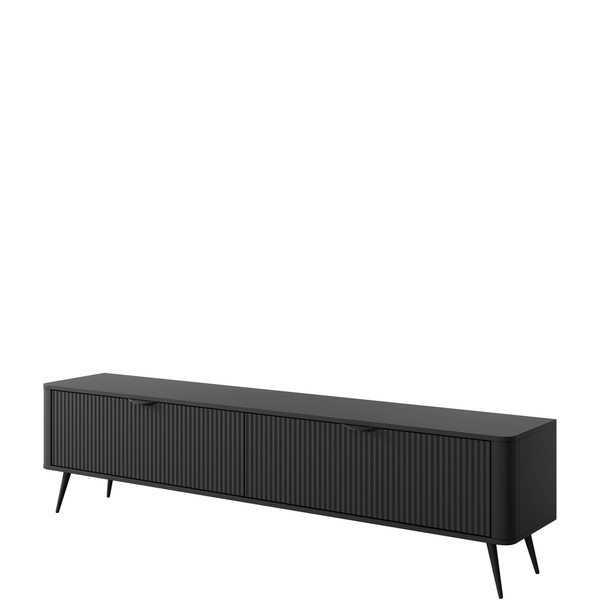 Szafka RTV stoi na czarnych, wysokich metalowych nóżkach, które nadają jej lekkości i dodają industrialnego charakteru. Nóżki nie tylko dodają nowoczesnego stylu, ale także ułatwiają sprzątanie pod meblem, co jest bardzo praktyczne w codziennym użytkowaniu.