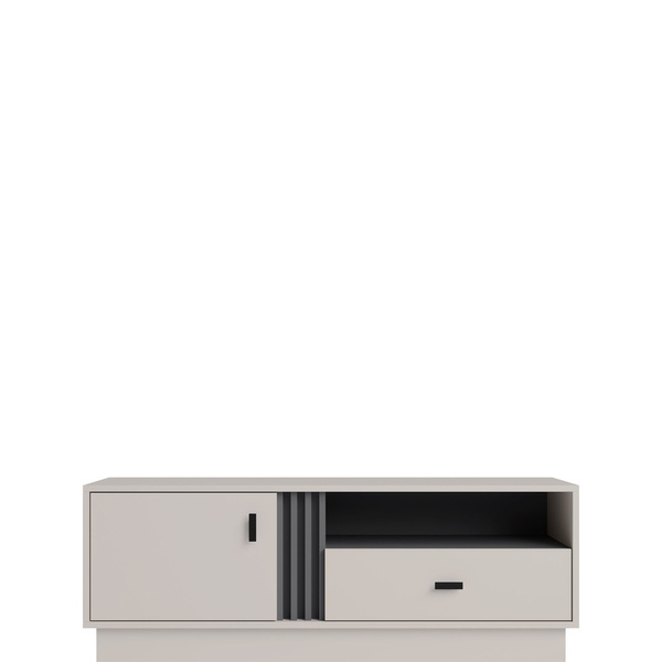Centralna część szafki wyposażona jest w pełne drzwi, za którymi znajduje się półka. Półka pomaga w organizacji przestrzeni i zapewnia porządek w strefie multimedialnej.