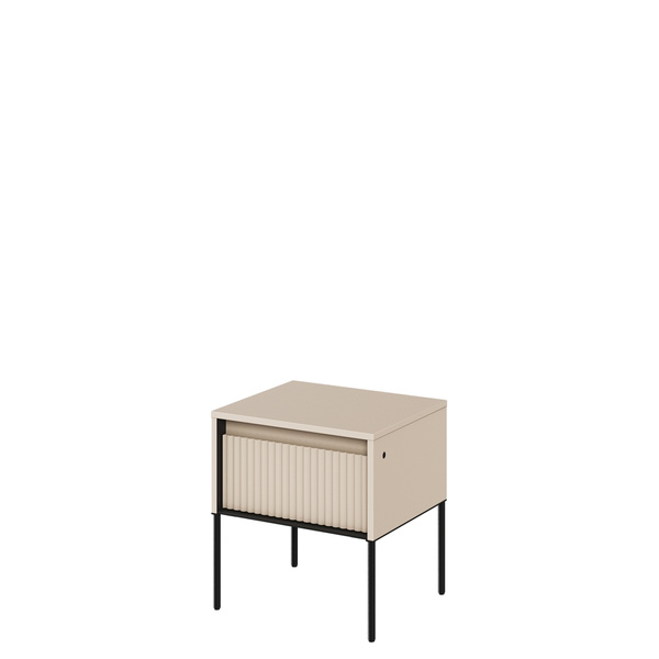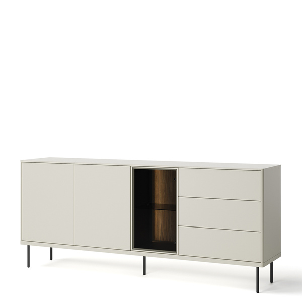 Szafka stoi na wysokich metalowych nogach, które nie tylko dodają jej elegancji, ale także ułatwiają utrzymanie czystości pod meblem. To szczególnie przydatne w domach z małymi dziećmi lub zwierzętami, gdzie podłoga musi być często odkurzana.
