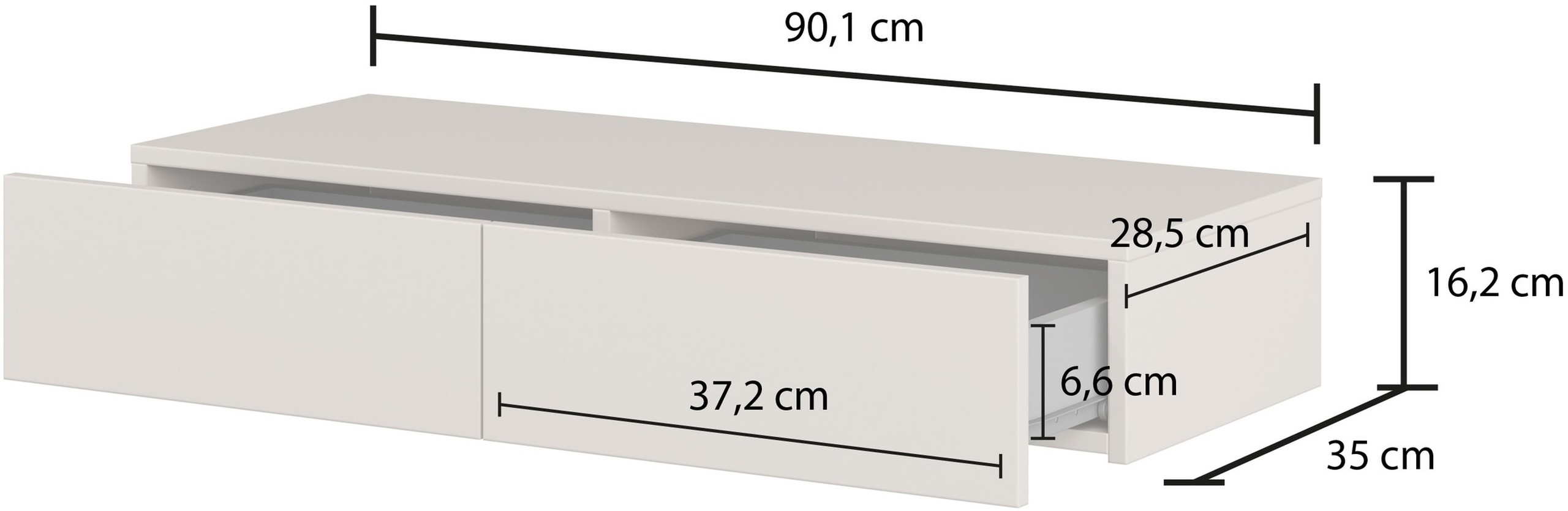 - Wymiary szuflad: szerokość 2x 37,2 cm, głębokość 28,5 cm, wysokość frontu 16,2 cm