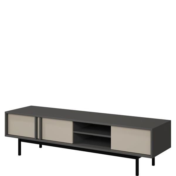 Szafka RTV 200 cm to nie tylko estetyka, ale również przemyślany układ przestrzeni. W środkowej części znajduje się otwarta wnęka, idealna na dekodery, konsole czy inne urządzenia multimedialne. Bezpośrednio pod nią umieszczono uchylany front, który ukrywa dodatkową przestrzeń na akcesoria. Boczne drzwiczki kryją pojemne schowki, w których wygodnie przechowasz książki, płyty czy inne drobiazgi.