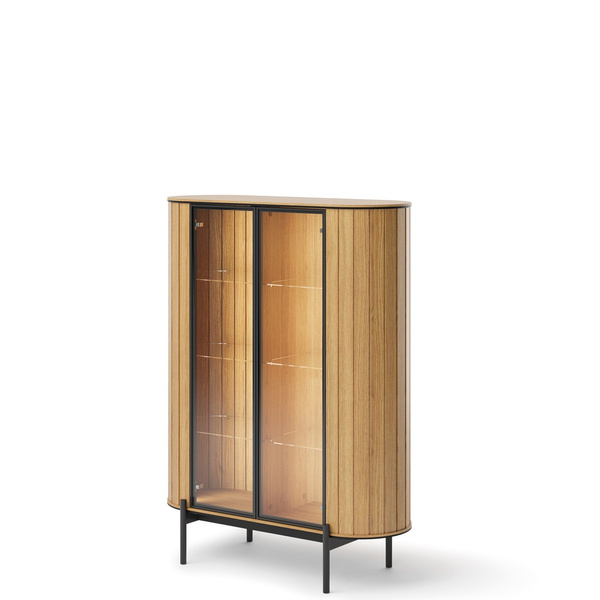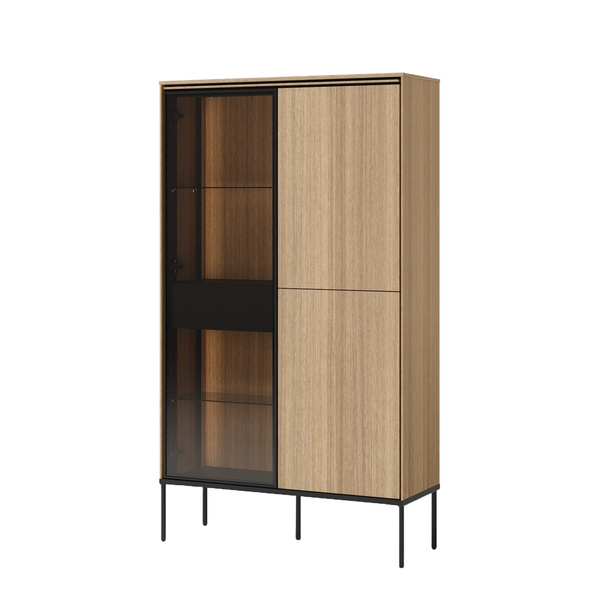 Dodaj do swojego wnętrza elegancję i praktyczność dzięki witrynie do salonu EPIRO. Ten mebel o szerokości 99 cm to połączenie nowoczesnego designu i przemyślanych rozwiązań do przechowywania. Wykonana w ciepłym kolorze kaszmir, zyskuje lekkość dzięki czarnym metalowym nogom, które podkreślają jej nowoczesny charakter.