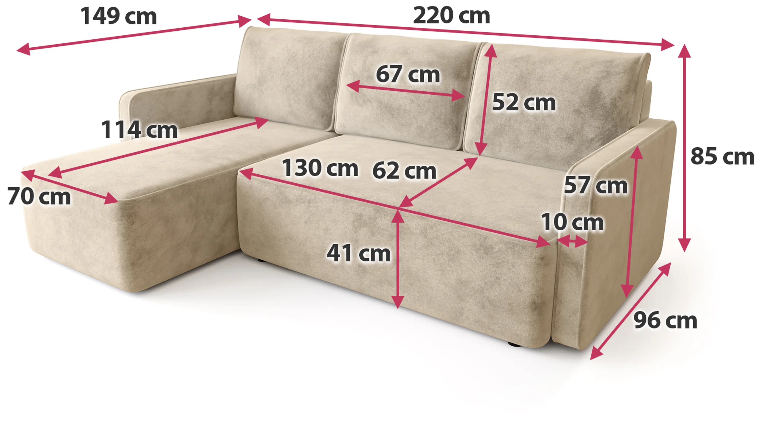 Zaproś do swojego salonu styl i funkcjonalność w najlepszym wydaniu. Ten narożnik to idealne połączenie komfortu, nowoczesnych rozwiązań i eleganckiego wyglądu. Dzięki funkcji spania o wymiarach 130x200 cm oraz zastosowaniu automatu DL, rozkładanie narożnika staje się szybkie i bezproblemowe. Siedzisko oparte na sprężynach falistych i piance PUR gwarantuje wygodę na najwyższym poziomie, a trzy grube poduchy oparciowe zapewniają optymalne wsparcie pleców podczas codziennego wypoczynku.