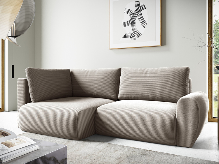 Ten narożnik to nie tylko wygodne miejsce do siedzenia, ale również funkcjonalne łóżko o powierzchni spania 198x126 cm, idealne dla niespodziewanych gości czy przyjemnych seansów filmowych z rodziną. Dzięki zastosowaniu nowoczesnego automatu rozkładania DL, przejście od eleganckiego narożnika do wygodnego łóżka zajmuje tylko kilka sekund. Dodatkowo mebel wyposażony jest w praktyczny pojemnik na pościel, zapewniając łatwy dostęp do niezbędnych akcesoriów.