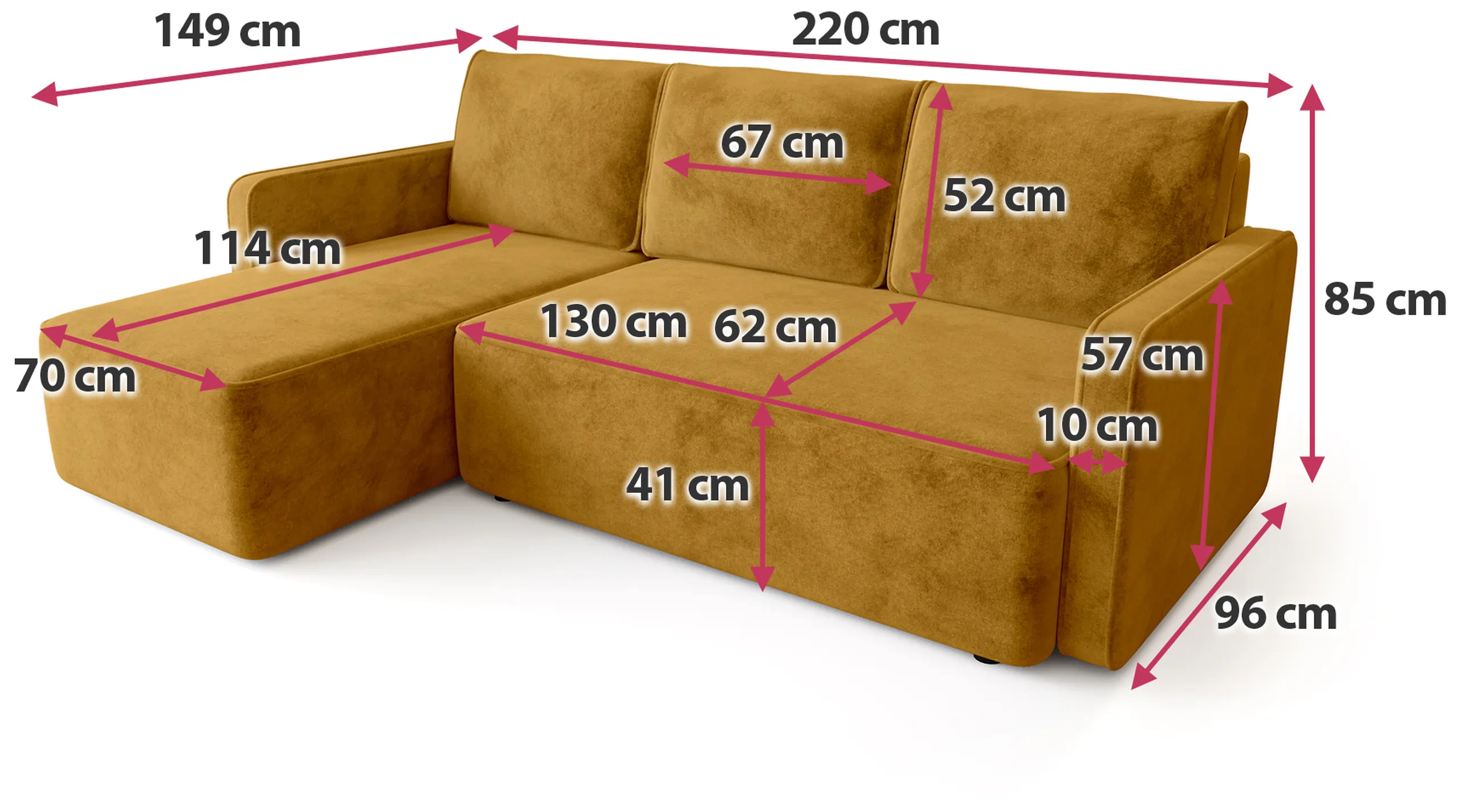 Zaproś do swojego salonu styl i funkcjonalność w najlepszym wydaniu. Ten narożnik to idealne połączenie komfortu, nowoczesnych rozwiązań i eleganckiego wyglądu. Dzięki funkcji spania o wymiarach 130x200 cm oraz zastosowaniu automatu DL, rozkładanie narożnika staje się szybkie i bezproblemowe. Siedzisko oparte na sprężynach falistych i piance PUR gwarantuje wygodę na najwyższym poziomie, a trzy grube poduchy oparciowe zapewniają optymalne wsparcie pleców podczas codziennego wypoczynku.