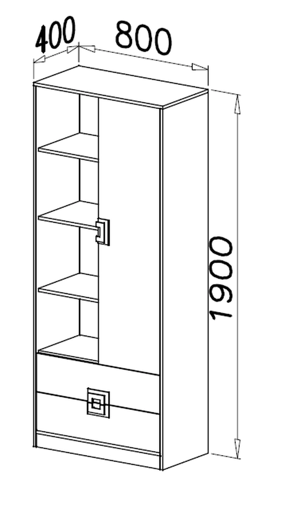Nowoczesny regał z szufladami o szerokości 80 cm z kolekcji NAMIKO. Regał zawiera cztery otwarte poziomy po lewej stronie, na których możemy zagospodarować miejsce na nasze książki. Po prawej stronie znajdziemy drzwi, a za nimi trzy półki gdzie zagospodarujemy je osobistymi akcesoriami czy ubraniami. Na dole miejsce znalazły dwie pojemne szuflady z pełnym wysuwem.
