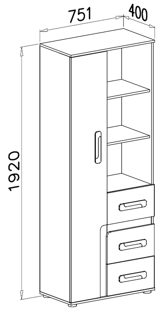 Nowoczesny regał z młodzieżowej kolekcji mebli systemowych MALE posiada trzy szuflady oraz dwie otwarte półki. Za drzwiami chowają się cztery półki, dzięki czemu regał stanowi idealne rozwiązanie dla osób, które uwielbiają porządek na półkach.
