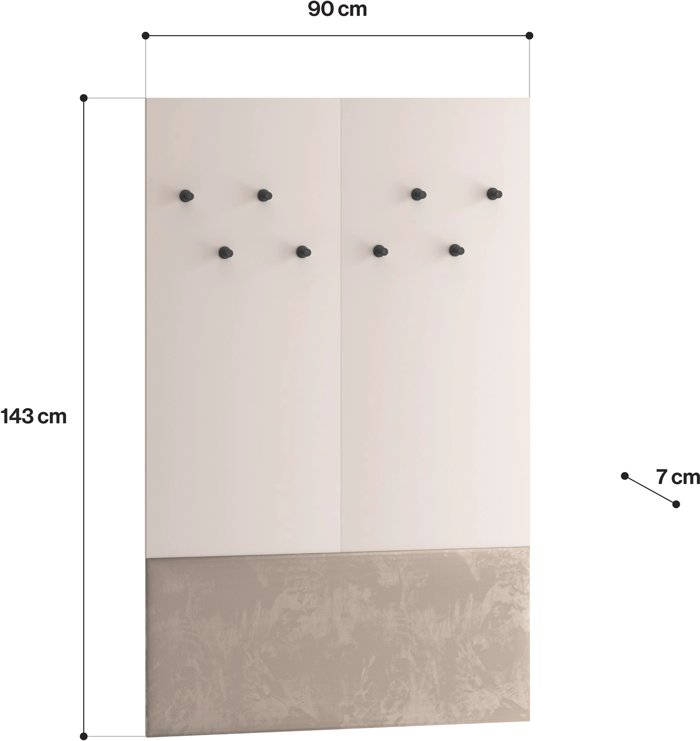 Panel tapicerowany na ścianę VOCO to praktyczny i stylowy mebel do przedpokoju, który łączy w sobie nowoczesny design z codzienną wygodą. Dzięki welurowemu wykończeniu w kolorze kaszmiru oraz aż ośmiu solidnym haczykom, stanowi idealne rozwiązanie dla każdego, kto ceni porządek, estetykę i funkcjonalność w swoim wnętrzu.
