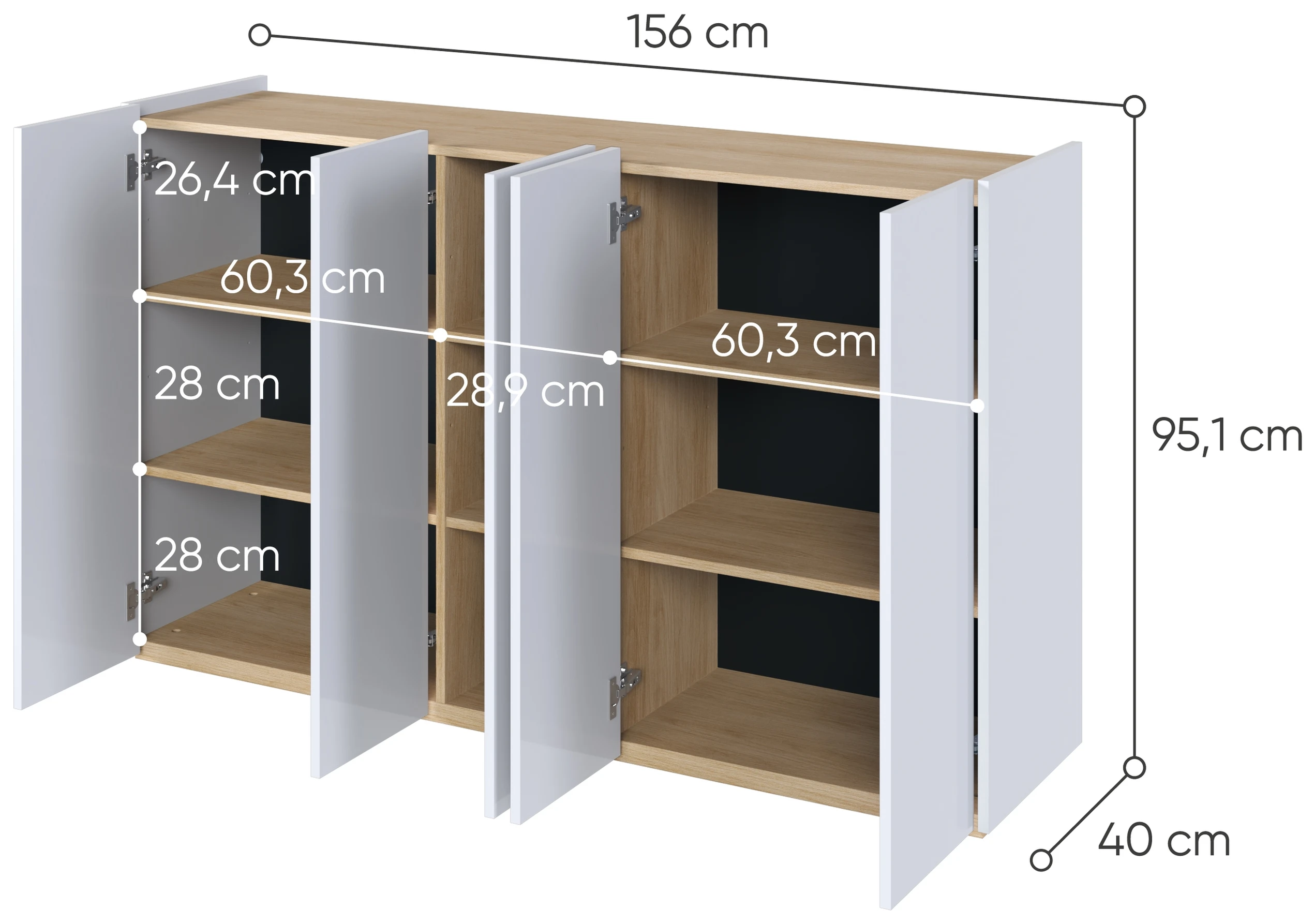 - Komoda posiada pięć drzwi wyposażonych w zawiasy puszkowe z cichym domykiem. Zapewni to ciche zamykanie i pozwoli zapomnieć o trzaskach i hałasach.