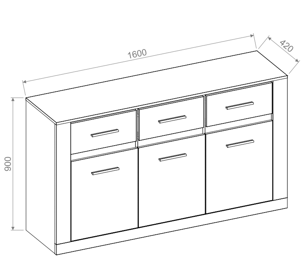 Komoda składa się z trojga drzwi z półkami oraz trzech szuflad, które umieszczone są na prowadnicach rolkowych, co zapewnia płynne i ciche otwieranie i zamykanie szuflad. Obrzeża komody zostały zabezpieczone okleiną ABS, co zwiększa ich trwałość i odporność na uszkodzenia mechaniczne. Nowoczesna stylistyka komody w połączeniu z jej funkcjonalnością sprawia, że idealnie pasuje do wielu aranżacji wnętrz, zarówno tych minimalistycznych, jak i bardziej eleganckich.