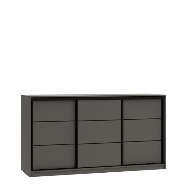 Komoda posiada trzy drzwi, które umożliwiają przechowywanie różnych przedmiotów wewnątrz. Nad drzwiami znajdują się trzy szuflady, które dodatkowo zwiększają przestrzeń do przechowywania i ułatwiają organizację. Obrzeże ABS, które otacza korpus komody, nie tylko chroni ją przed uszkodzeniami, ale także dodaje wykończenia i trwałości.