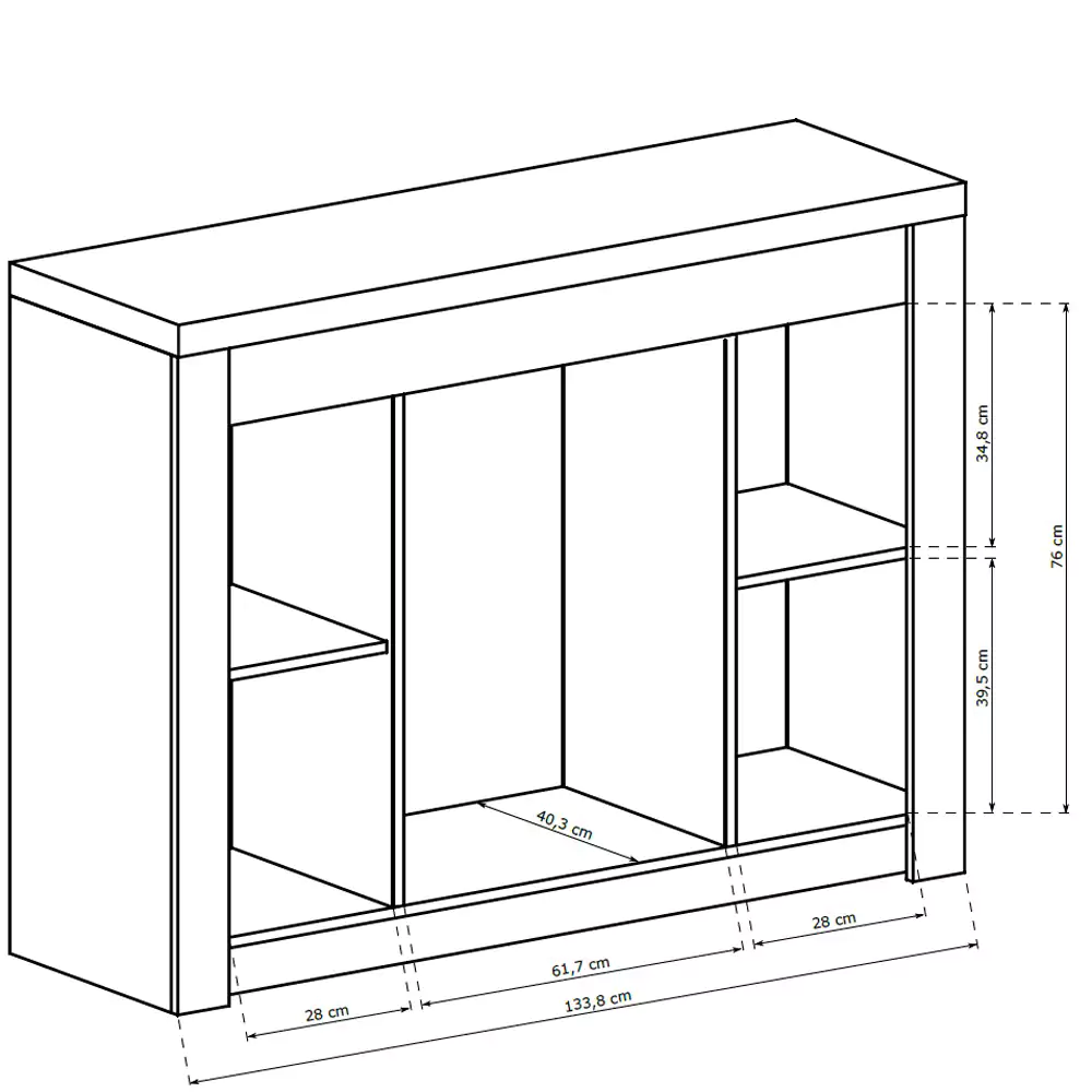 Komoda INELI posiada drzwi z prawej oraz lewej strony, za każdymi z nich znajduje się półka. Natomiast w centralnej części komody swoje miejsce znalazły cztery pojemne szuflady, które doskonale sprawdzą się do przechowania części garderoby oraz rozmaitych akcesoriów.