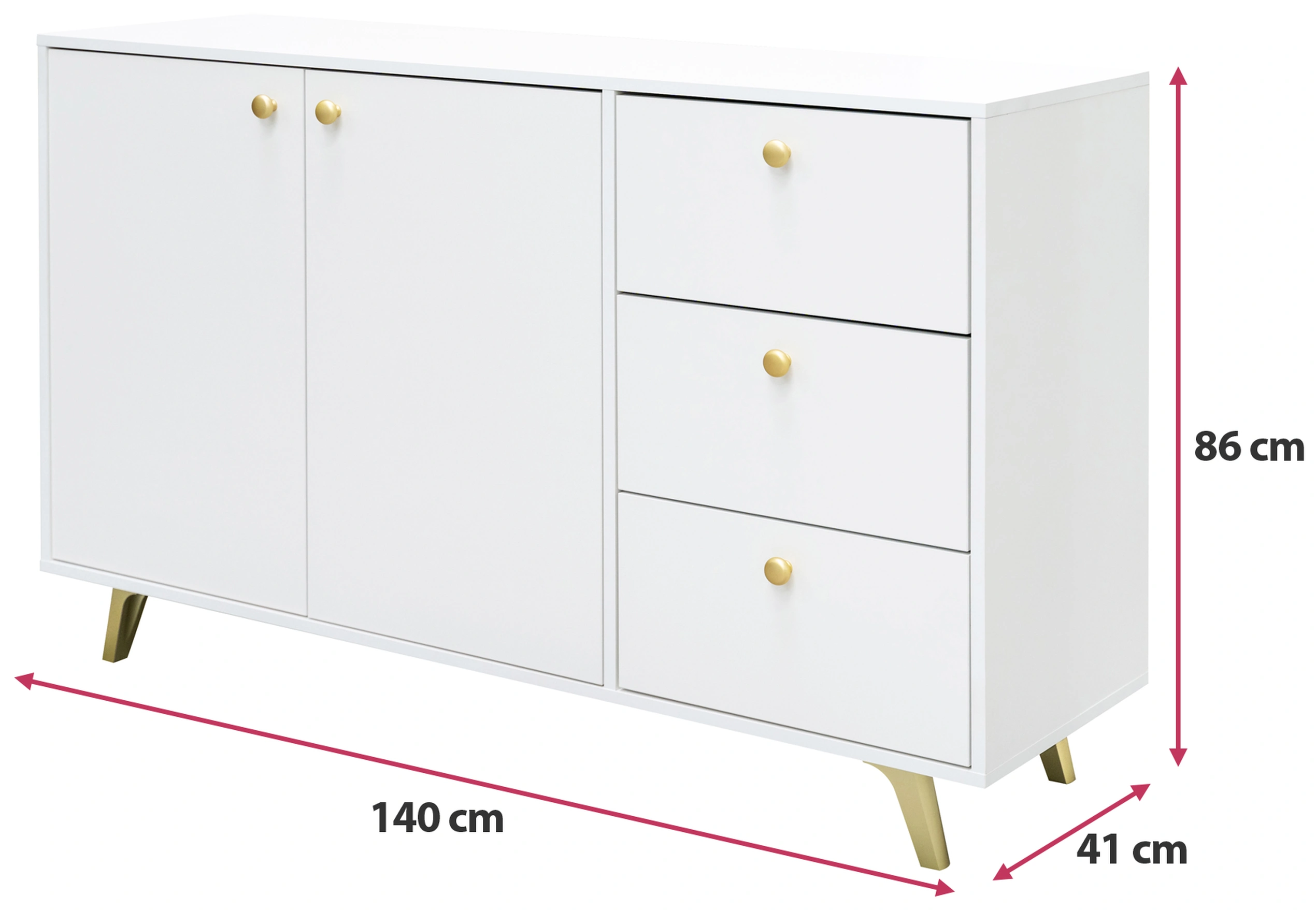 Komoda o szerokości 140 cm SELMA to doskonałe połączenie elegancji i funkcjonalności, które wzbogaci każde wnętrze, nadając mu wyjątkowego charakteru. Jej przemyślana konstrukcja zapewnia optymalną przestrzeń do przechowywania, a stylowe detale, takie jak złote uchwyty, dodają całości luksusowego akcentu.