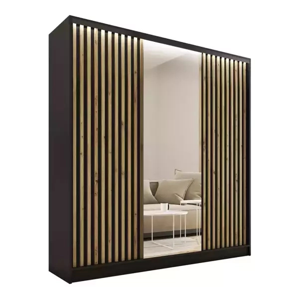 - Stalowe uchwyty w czarnym kolorze zostały umieszczone na krawędziach drzwi. Zostały wykonane w kolorze prowadnicy, dzięki czemu doskonale komponują się z całością szafy.