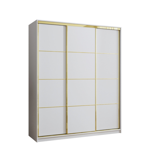 Dodaj swojej sypialni nuty luksusu i porządku dzięki eleganckiej szafie przesuwnej o szerokości 280 cm. Połączenie lustra, złotych detali i praktycznego układu wnętrza sprawia, że to idealne rozwiązanie do przechowywania ubrań, które jednocześnie staje się ozdobą wnętrza. Środkowe drzwi z lustrem optycznie powiększają przestrzeń, a złoty system przesuwny ze szprosami nadaje szafie nowoczesny, a zarazem szykowny charakter.