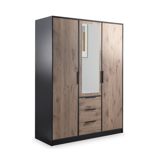 Szafa wyposażona jest w trzy przesuwne drzwi na solidnym stalowym systemie przesuwnym w eleganckim czarnym kolorze. Taka konstrukcja zapewnia nie tylko estetyczny wygląd, ale również oszczędność miejsca w sypialni czy garderobie. Czarne stalowe uchwyty dopełniają całości, podkreślając nowoczesny charakter mebla.