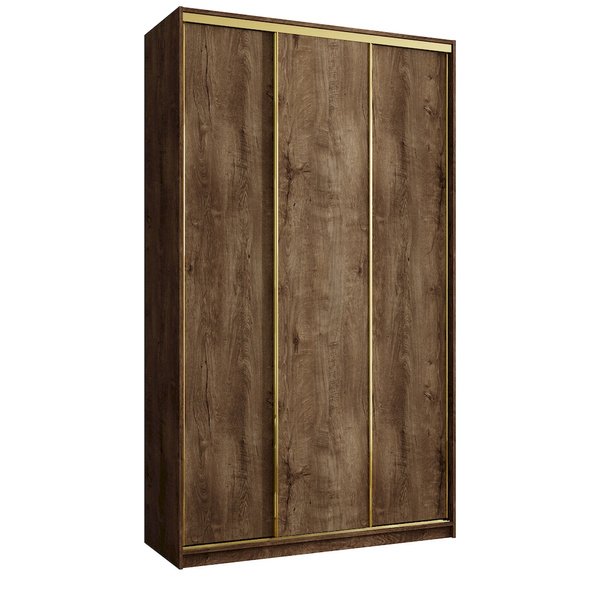 Złote detale nadają szafie wyjątkowego charakteru i sprawiają, że staje się nie tylko praktycznym, ale i dekoracyjnym elementem wnętrza. System przesuwny ze stali gwarantuje komfort użytkowania na co dzień, a solidne wykończenie obrzeży zabezpiecza mebel przed uszkodzeniami.