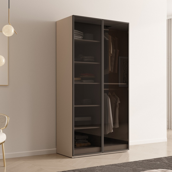 Na centralnych drzwiach szafy znajduje się lustro, które optycznie powiększa przestrzeń, wprowadza do wnętrza więcej światła i pełni praktyczną funkcję codziennego lustra. Dzięki swojej uniwersalnej stylistyce szafa świetnie wpasuje się w aranżację zarówno nowoczesnych sypialni, jak i przestronnych garderób.