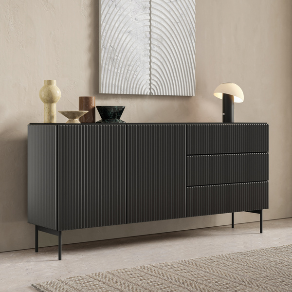Stalowe uchwyty w czarnym kolorze zostały umieszczone na krawędziach drzwi. Zostały wykonane w kolorze prowadnicy, dzięki czemu doskonale komponują się z całością szafy.
