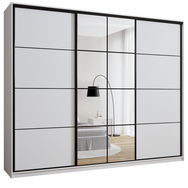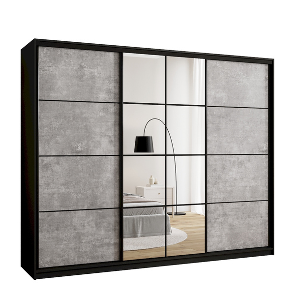 Dodaj swojej sypialni nuty luksusu i porządku dzięki eleganckiej szafie przesuwnej o szerokości 200 cm. Połączenie lustra, złotych detali i praktycznego układu wnętrza sprawia, że to idealne rozwiązanie do przechowywania ubrań, które jednocześnie staje się ozdobą wnętrza. Środkowe drzwi z lustrem optycznie powiększają przestrzeń, a złoty system przesuwny ze szprosami nadaje szafie nowoczesny, a zarazem szykowny charakter.