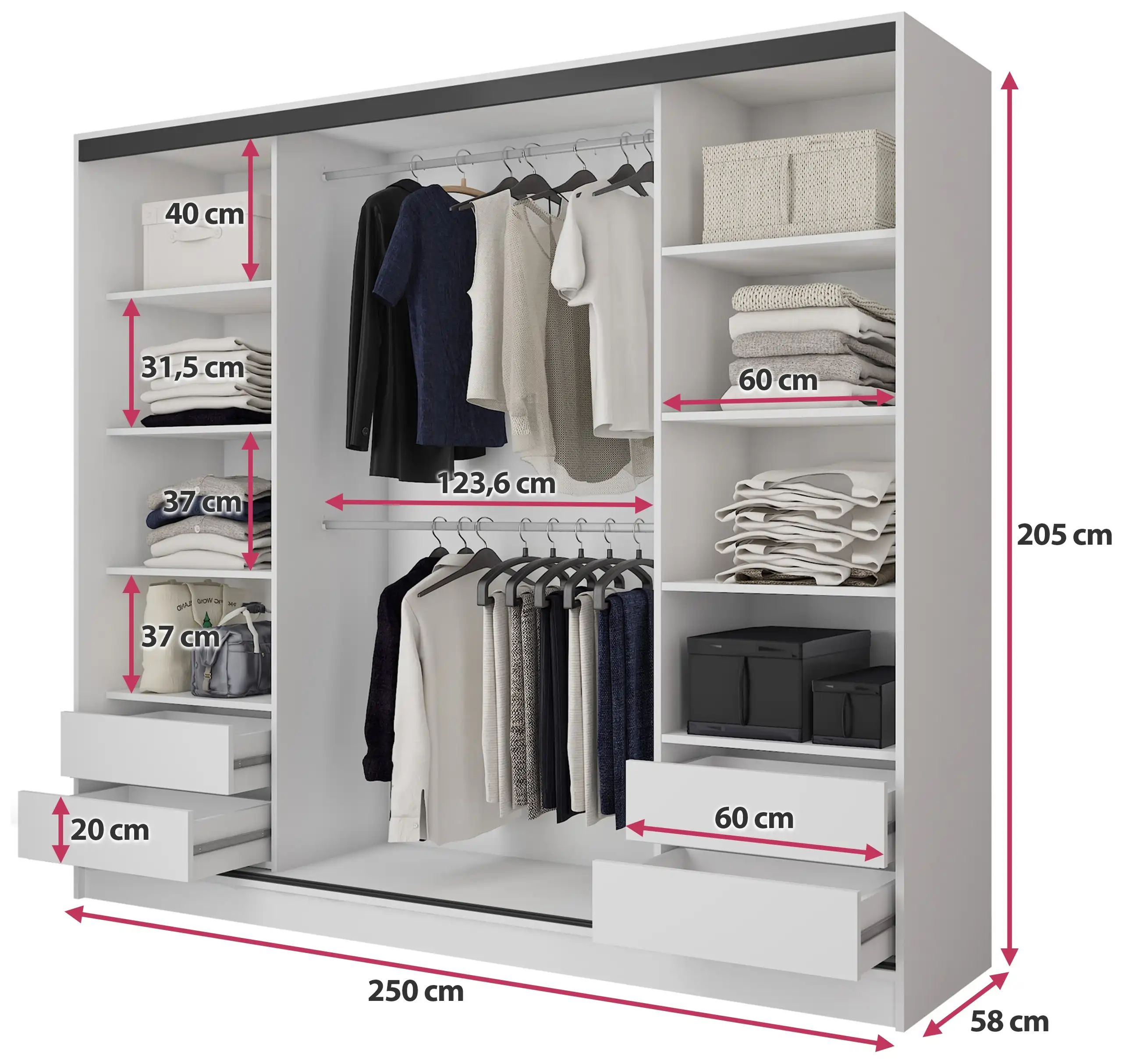 Wnętrze szafy zostało zaprojektowane z myślą o maksymalnym wykorzystaniu przestrzeni.Dwa metalowe drążki na wieszaki, umieszczone na różnych wysokościach, umożliwiają wygodne przechowywanie zarówno długich płaszczy, jak i krótszych ubrań. Dodatkowo,osiem półekzapewnia mnóstwo miejsca na składane ubrania, pościel czy inne przedmioty, umożliwiając zachowanie porządku i łatwego dostępu do potrzebnych rzeczy.