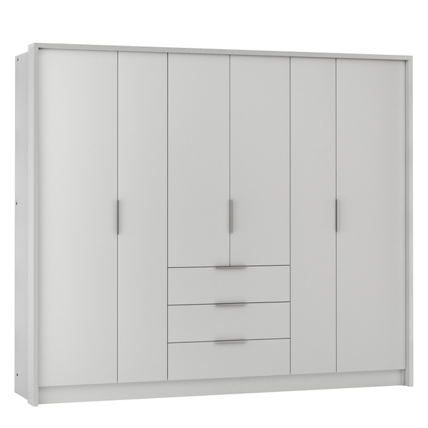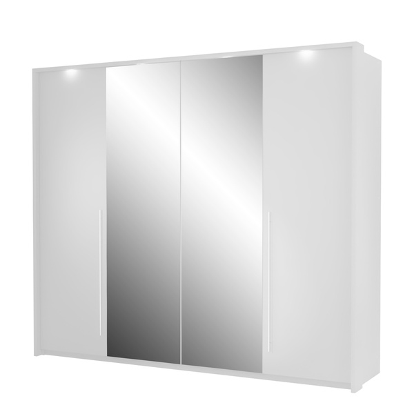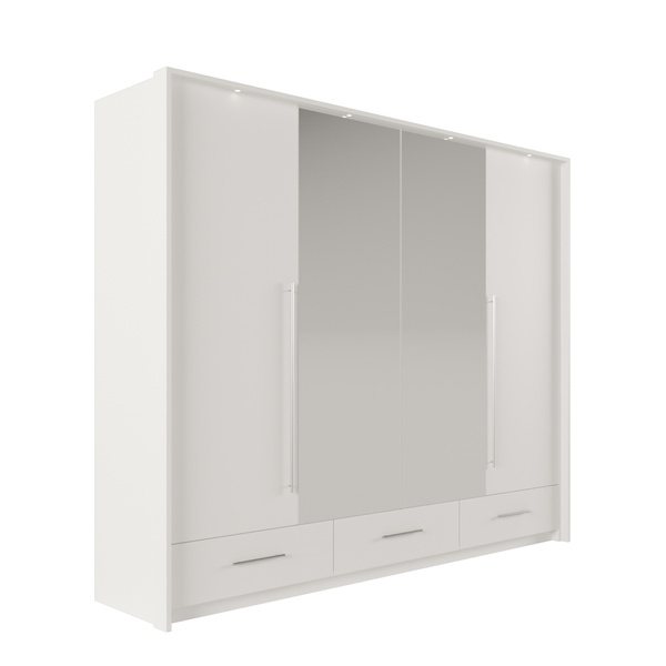 Ta wyjątkowa szafa wyposażona jest w cztery drzwi na zawiasach puszkowych, które gwarantują cichą i płynną obsługę. Co więcej, na każdym z zewnętrznych drzwi znajduje się pełnowymiarowe lustro, dzięki czemu szafa ta jest idealna do przestrzeni sypialnianej czy przedpokoju, pomagając w codziennych przygotowaniach.
