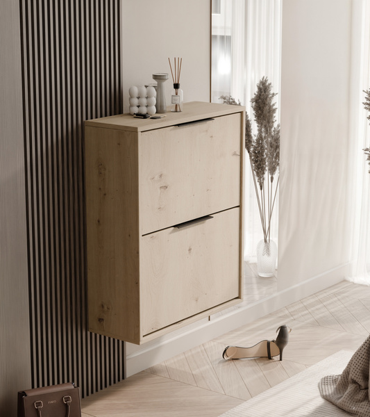 Szafka MAVIA to idealne rozwiązanie do przedpokoju – kompaktowa, funkcjonalna i stylowa. Dwie osobne przegrody pomieszczą najważniejsze pary butów, a nowoczesna forma mebla wpisze się w każde wnętrze. Możesz ją powiesić lub postawić – wybór należy do Ciebie.