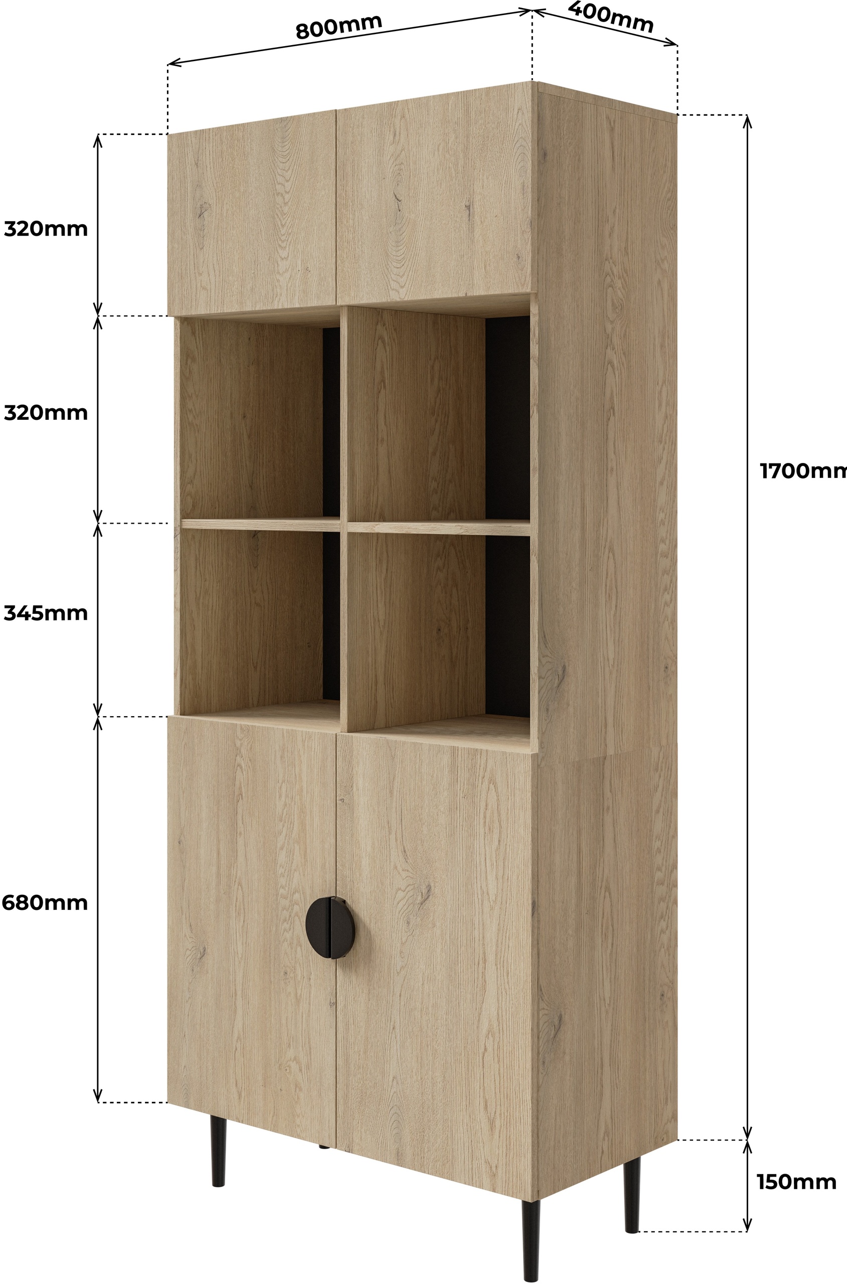 - Wymiary całkowite: szerokość 80 cm, głębokość 40 cm, wysokość 185 cm (w tym nóżki 15 cm)
