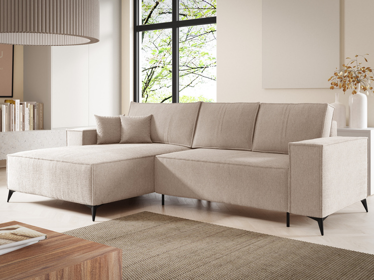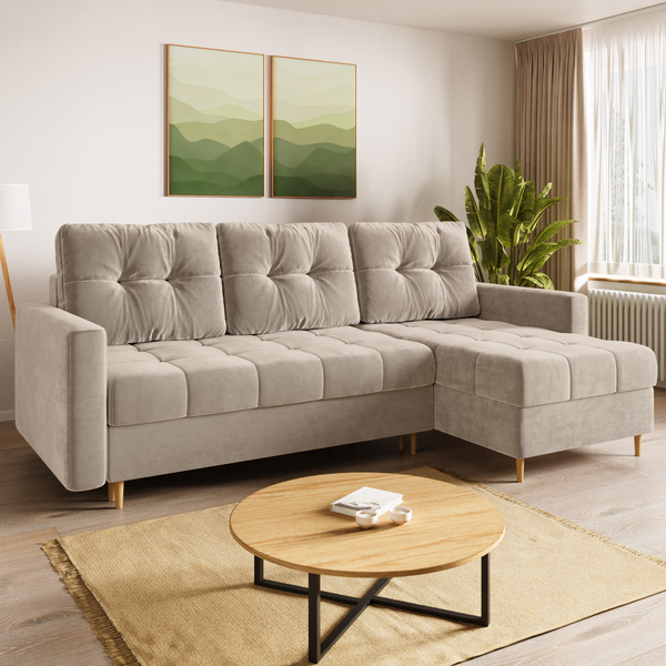 Obicie z miękkiego sztruksu nadaje narożnikowi wyjątkowy charakter, a jego neutralny odcień pasuje do różnych aranżacji wnętrz. Tapicerowany tył sprawia, że mebel prezentuje się świetnie niezależnie od ustawienia – zarówno pod ścianą, jak i w centralnej części pokoju.