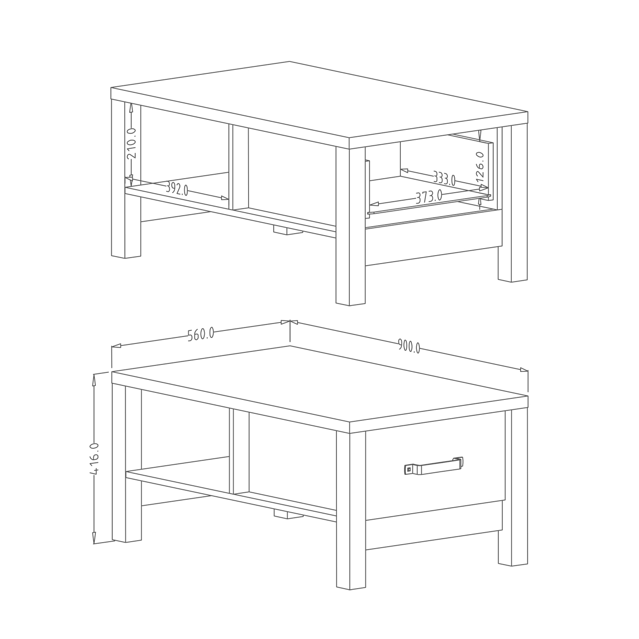 Funkcjonalny stolik kawowy o szerokości 90 cm w stylu industrialnym, wyposażony w szufladę i półkę.
