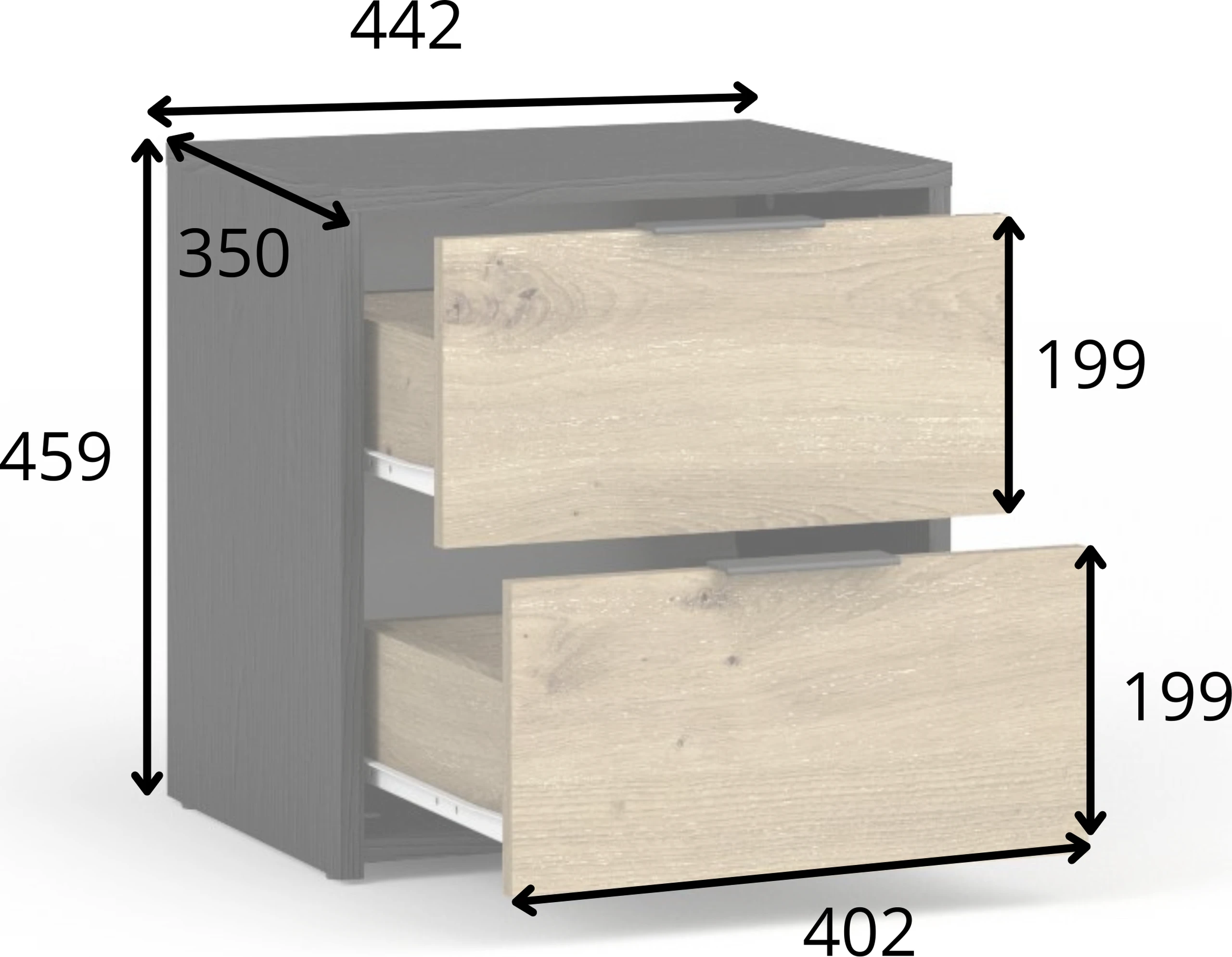 - Stolik nocny z 2 szufladami – idealny do przechowywania niezbędnych rzeczy przy łóżku