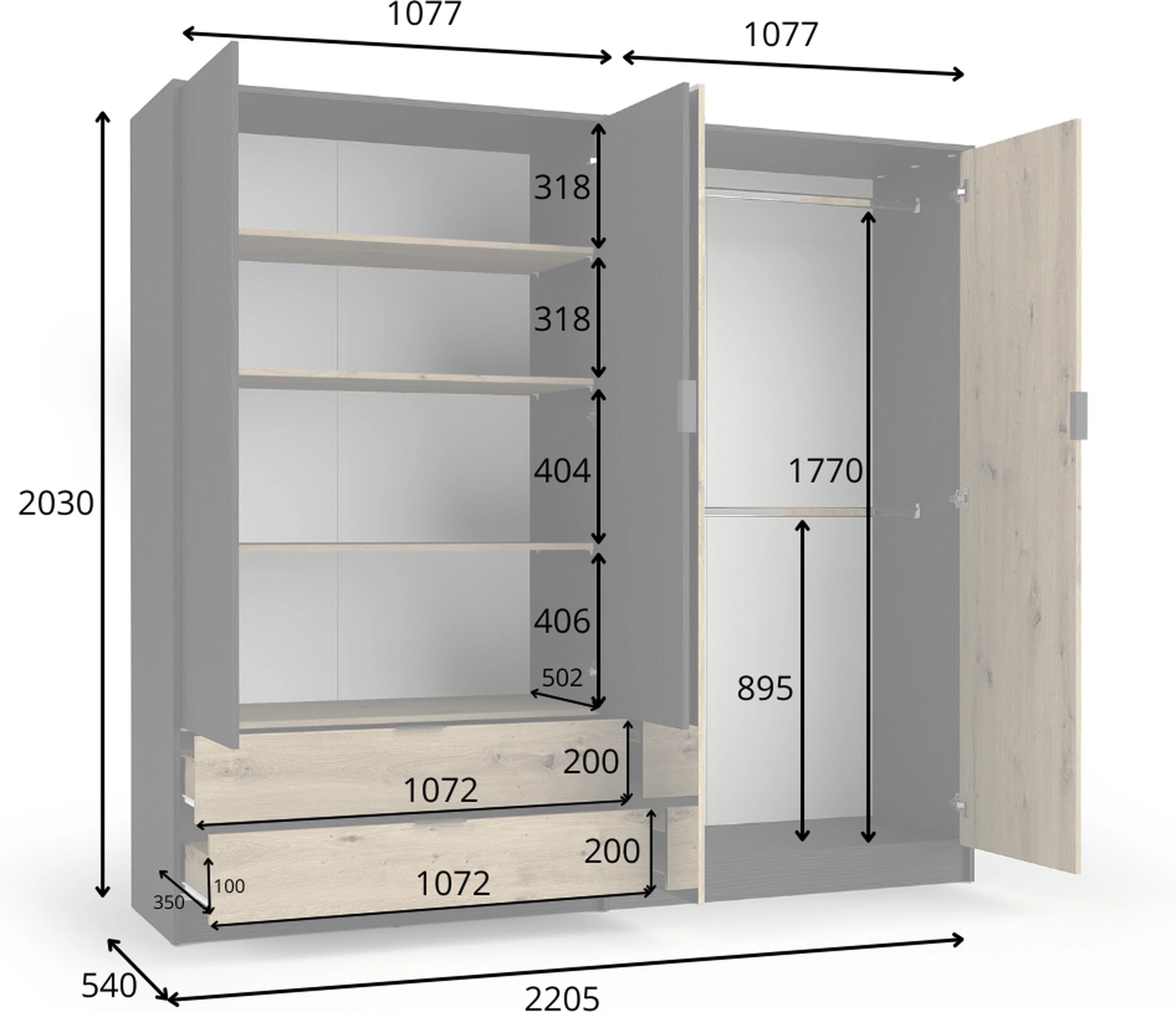 - Wymiary: szerokość 220 cm, wysokość 203 cm, głębokość 54 cm